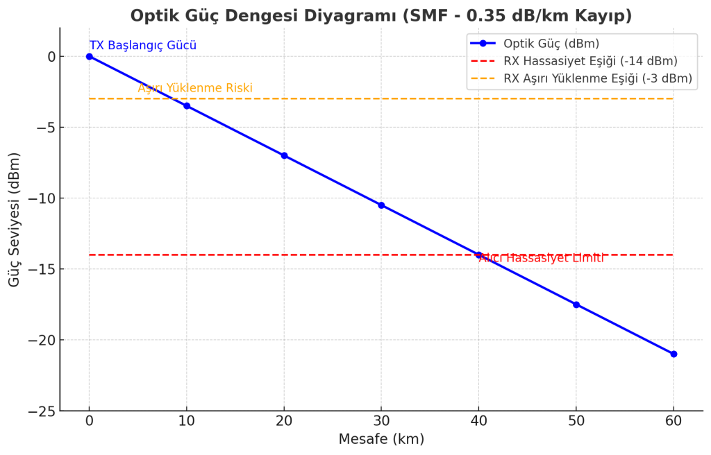 Bu grafikte, SMF üzerinde 0 dBm başlangıç TX gücünün mesafeye bağlı olarak nasıl zayıfladığını, alıcı hassasiyet eşiğini (-14 dBm) ve aşırı yüklenme sınırını (-3 dBm) görebilirsiniz.