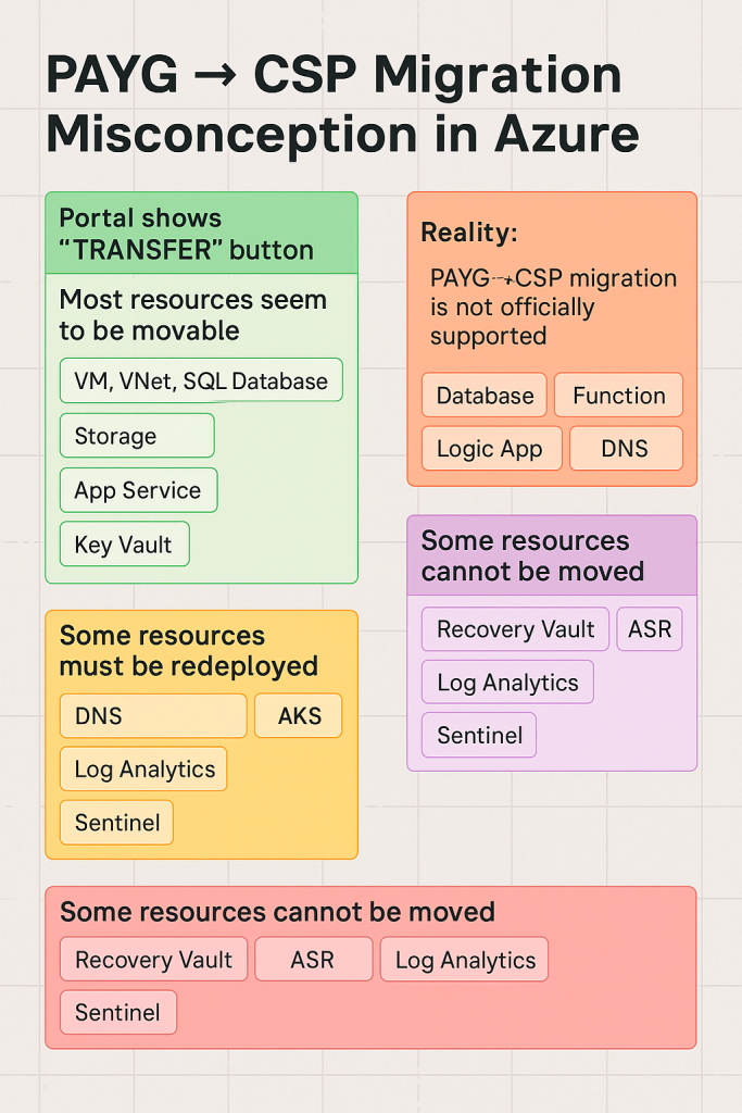 Azure portalında “Transfer” veya “Move” gibi düğmeleri gördüğümüzde çoğu kişi bunun mümkün olduğunu varsayar. Oysa Microsoft, PAYG → CSP geçişini resmî olarak desteklemez.